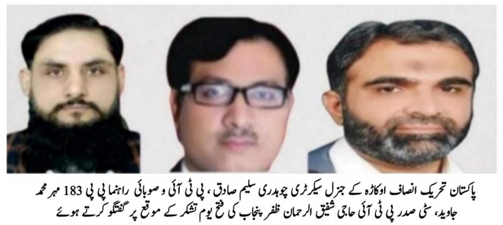 اوکاڑہ(میاں سلیم بشیر کامیانہ ڈسٹرکٹ رپورٹر)پاکستان تحریک انصاف اوکاڑہ کے جنرل سیکریٹری چوہدری سلیم صادق ، پی ٹی آئی و صوبائی راہنما پی پی 183 مہر محمد جاوید، سٹی صدر پی ٹی آئی حاجی شفیق الرحمان ظفر نے کہا کہ اعلیٰ عدلیہ نے انصاف کے تقاضوں کی پورا کرتے ہوئے تاریخی فیصلہ سنایا اس فیصلے کو سنہری حروفوں میں لکھا جائے گا ان کرپٹ حکمران کو ان کی اصل جگہ اپنے گھر کا راستہ دکھا کر عوام کے دل جیت لیے یہ تاریخی فتح انصاف اور عوام کی فتح ہے ان خیالات کا اظہار انہوں نے صدر رینالہ پریس کلب راؤ عتیق گوہر، سینئر نائب صدر شیخ آصف علی سے پنجاب کی فتح پر یوم تشکر مناتے ہوئے خصوصی گفتگو کرتے ہوئے کیا انہوں نے کہا کہ تمام کرپٹ حکمرانوں پی ڈی ایم نے عوام کو بےوقوف بنایا لیکن اب ہمارے لیڈر محب پاکستان چیئرمین تحریک انصاف عمران خان نے عوام کو شعور دلایا کہ یہ کرپٹ ٹولہ ملک پاکستان کی لوٹی ہوئی دولت پر عیاشیاں کررہے ہیں اور انہی پیسوں سے عوام کا مینڈیٹ چھین رہے ہیں اب عوام باشعور ہوچکی ہے ان کرپٹ سیاست دانوں کی چالوں کو سمجھ چکی ہے اس لیے اس ضمنی الیکشن میں ان کو عبرت ناک شکست کا سامنا کرنا پڑا ان شاء اللہ آنے والے قومی الیکشن میں اوکاڑہ ، رینالہ سمیت پورے پاکستان میں تحریک انصاف کی جیت ہوگی اور ان کو منہ چھپانے کی جگہ نہ ملے گی